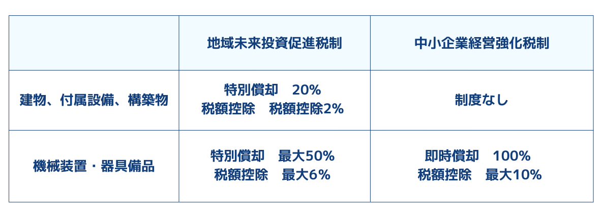 そのため建物は地域未来投資促進税制、機械や備品は中小企業経営強化税制といったように、